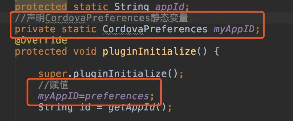 2 在Wechat类中申明一个CordovaPreferences的静态变量,并在pluginInitialize()方法其赋值