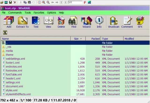 我们把这个文档保存到本地,将其扩展名从.docx改成.zip, 然后双击,就可以用解压软件比如winrar打开。