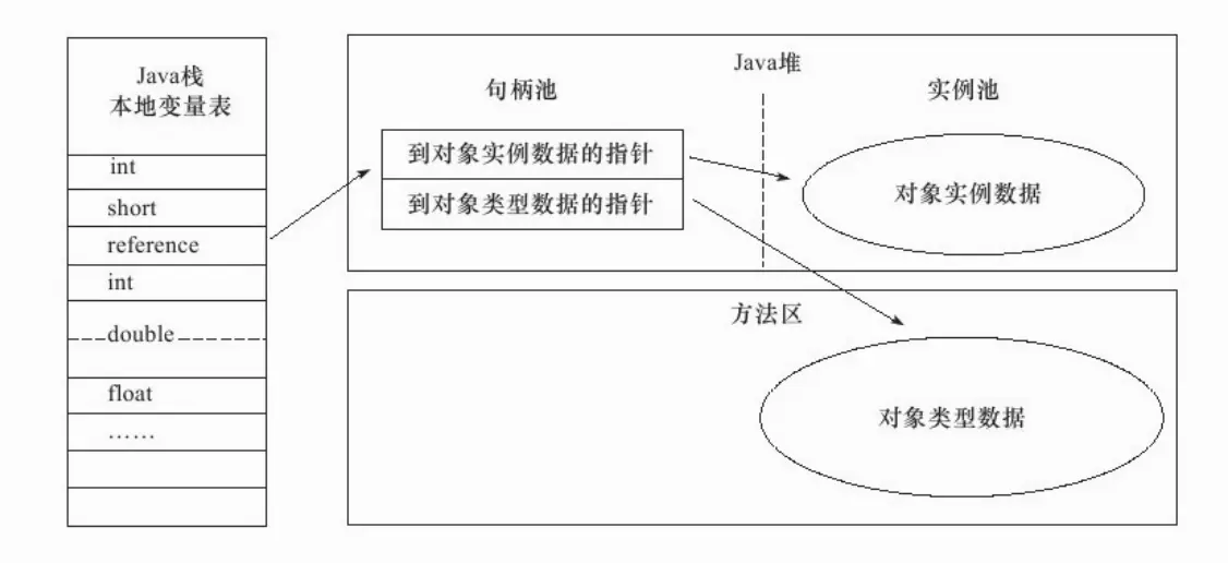 如果使用句柄访问的话,那么Java堆中将会划分出一块内存来作为句柄池,reference中存储的就是对象的句柄地址,而句柄中包含了对象实例数据与类型数据各自的具体地址信息,如图所示。