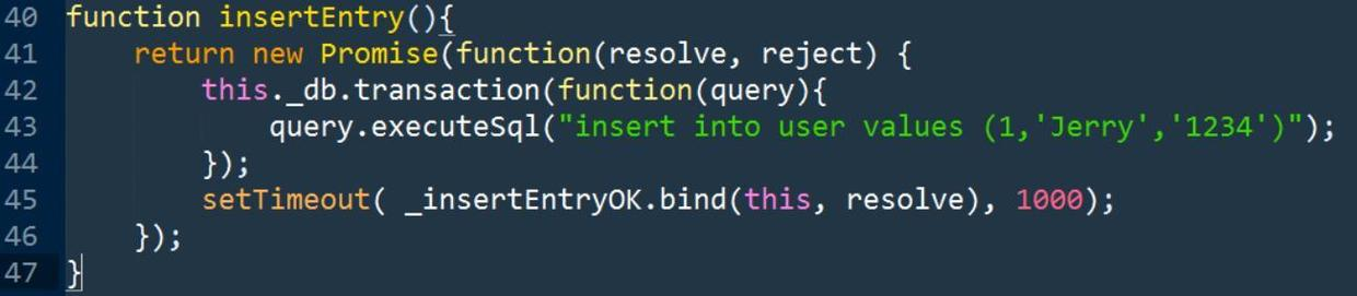 用promise实现了一个链式调用,第九行代码从语义上来说很容易理解:首先创建数据库(createDatabase),然后创建数据库表(createTable),然后插入一条记录到数据库表里(insertEntry), 然后马上把刚才插入表里的记录读出来(readEntry)。最后打印到浏览器上。