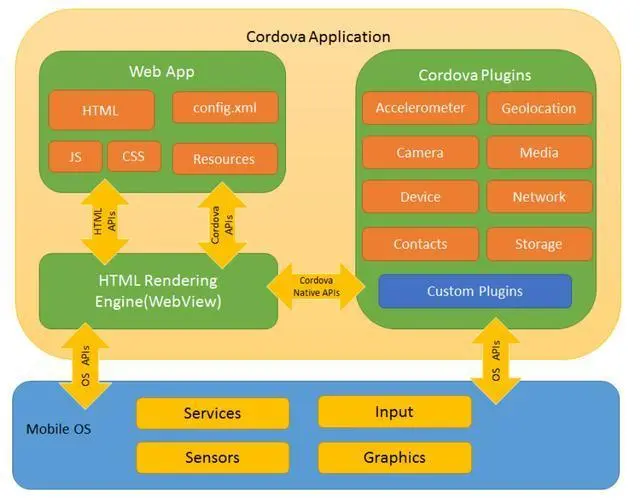以Android框架为例,Cordova能将您的前端应用里的JavaScript和HTML资源打包成Android原生的apk文件,可以直接在安卓手机上安装。运行时,这些JavaScript和HTML直接运行在Cordova提供的一个嵌入式的WebView控件里,对于手机用户来说,他们对此毫不知情,以为自己使用的是手机原生应用。