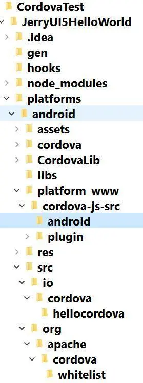 于是一个新的Cordova项目被自动创建出来了。里面包含很多子文件夹。