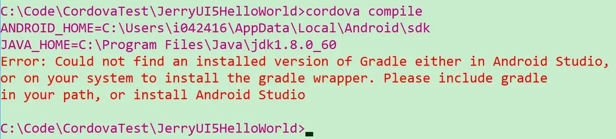 注意cordova compile这个命令需要您本地安装Gradle,如果安装,会遇到下列错误消息: