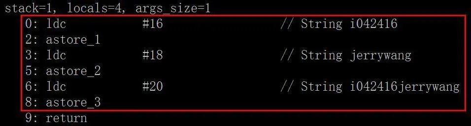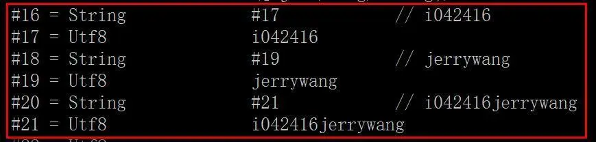 可以看到,在编译阶段,编译器字节把两个字符串常量的值进行拼接,结果"i042416jerrywang"存储到变量aa3中, 作为一个新的字符串常量, 在常量池中代号为#21。