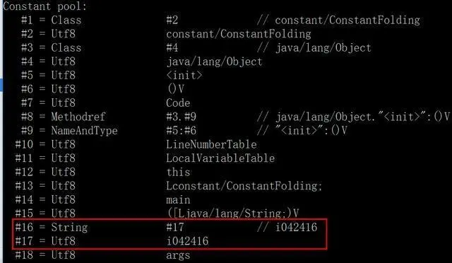 我们看到字符串 "i042416" 被Java编译器加到了常量池里。