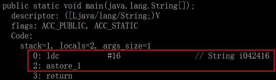 2. astore_1:将"i042416"的引用存储到序号为1的本地变量中(即我们代码中的局部变量a)。