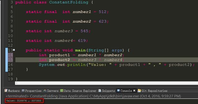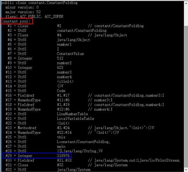 我们从下图的常量池列表能发现,序号为#29的常量318976正是整型常量number1(512)和整型常量(623)的积。由此可以看出, number1 * number2这个表达式,因为参与运算的两个操作数通过STATIC和FINAL修饰成为了整型常量,因此其积在编译期就能得到,所以编译器在编译时就计算出来,存储在变量池里,序号为#29。
