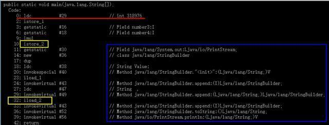 既然整型变量的乘积需要打印出来,因此字节码的iload_2将之前用istore_2保存在局部变量2中的计算结果又加载到栈上,这样乘积结果最后就能输出了。