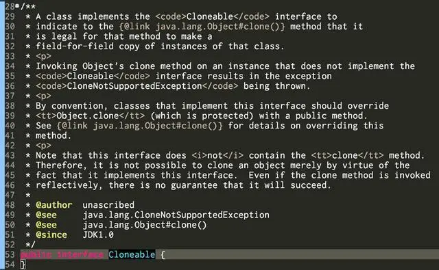 大家看另一个标记接口,Cloneable。下图第51行清晰标注了该接口从JDK1.0起就有了。