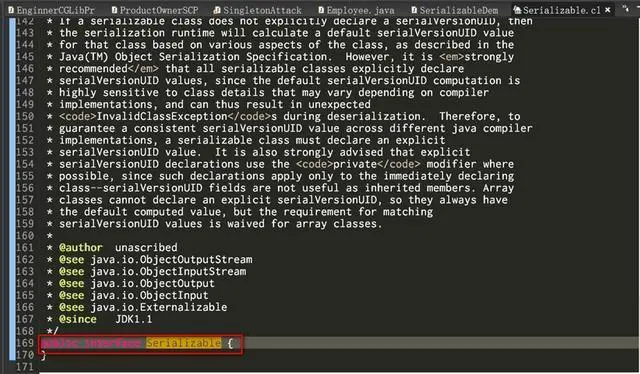 Java里的序列化,字符串,数组,枚举类和普通类是分别进行的。如果当前待序列化的变量既不是字符串,也不是数组和枚举类,那么就检测该类是否实现了Serializable的接口,大家注意下图第1177行就执行了这种检测。如果没有实现Serializable接口,就会抛出异常NotSerializableException。