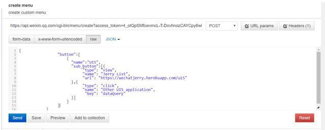上述json格式的报文定义了一个一级菜单,标签文本为UI5。两个二级菜单(sub_button),类型分别为view和click。