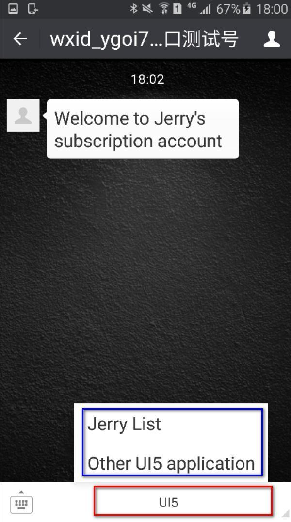 view类型即绑定一个HTML页面到该二级菜单,点击之后跳转到这个页面去。我的例子绑定的html页面是http://wechatjerry.herokuapp.com/ui5。 类型为click的菜单很好理解,点击后,微信平台会发送一个事件给您公众号的微信服务器上。您需要在您的微信服务器里对这个时间做处理。事件类型通过参数key指定,我上述例子的类型是dataQuery,这个参数可以随意指定。