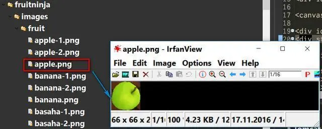 如果大家想修改在游戏里登场的水果图标,直接把文件夹images/fruit下面的图片文件替换即可。以苹果为例,apple.png代表完整的苹果,apple-1.png和apple-2.png分别代表被切成两半的苹果左半部份和右半部份。