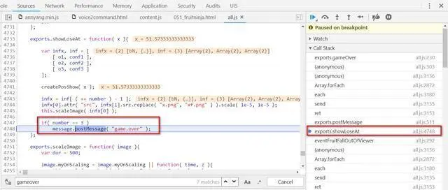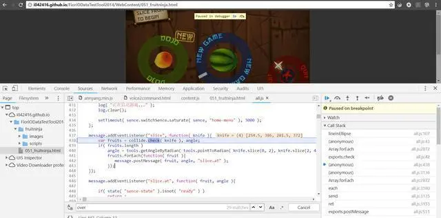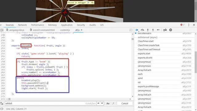 我们在玩这个游戏时,如果在JavaScript文件all.js的slice事件处理函数里设置断点,就能观察到JavaScript实现是如何检测水果刀(是否)切到了水果:collide.check: