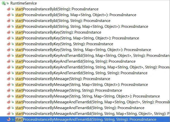 - 使用 RuntimeService 启动流程并返回实例,它提供了多种启动流程的方法: