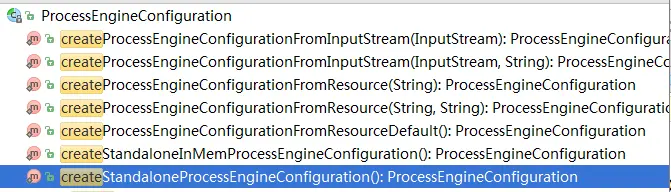 - 首先创建流程引擎实例,这里我们使用了 createStandaloneInMemProcessEngineConfiguration() 方法,创建了一个使用 H2 内存数据库的流程引擎实例(默认 JdbcUrl 为