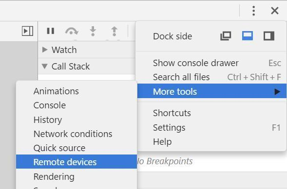 先说Cordova前端代码如何调试。这里我以Android安卓平台为例。首先打开安卓手机的调试模式,然后用数据线连接到电脑上。打开Chrome开发者工具,Settings->More tools->Remote devices:
