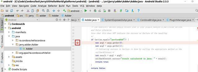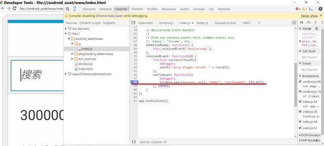 在手机上再次执行Cordova应用,JavaScript代码里调用Cordova插件的入口如下。插件名称Adder,对应Java里的同名类,插件方法performAdd,会在Java类Adder里得到处理: