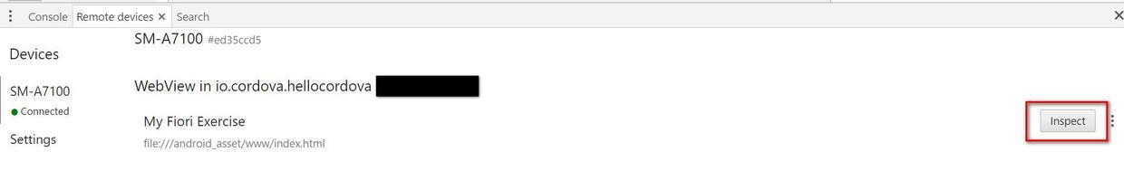 2. 在我的三星手机上启动Cordova应用,然后在Chrome开发者工具里能看到SM-A7100对应的应用列表里出现了一个"WebView in io.cordova.hellocordova....", 这条记录就是我在三星手机上运行的Cordova应用,前面已经说了,该应用实际上是运行在一个嵌入的Webview里的。点击”Inspect"按钮: