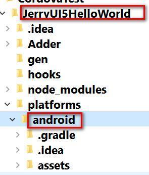 假设我的Cordova项目名称为JerryUI5HelloWorld,在这个文件夹下有一个子文件夹platforms,找到里面的android文件夹: