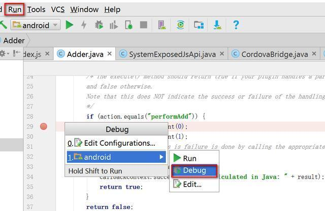 用Android Studio打开这个android子文件夹。找到你的插件实现文件,在Android Studio里设置好断点。