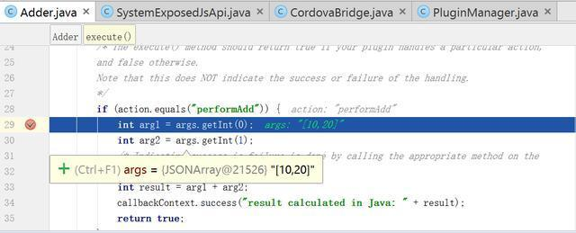 例如下图第38行,实际就是从Cordova JavaScript代码执行到我自己开发的基于Android平台的Cordova插件代码的入口位置。
