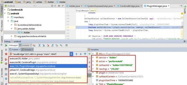 从Android Studio里的调用栈能进一步研究我们开发的Cordova插件是如何通过Cordova框架从JavaScript端被调用的:
