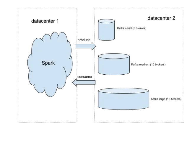 The figure above illustrates the setup of our test platform for this study. We use Spark to host Kafka clients, which allows us to produce and consume traffic at an arbitrary scale. We set up three Kafka clusters of different sizes so that tuning cluster size is as simple as redirecting traffic to a different destination. We created a Kafka topic to generate the producing and consuming traffic for the test. For the sake of simplicity, we spread the traffic evenly across brokers. To achieve that, we created the testing topic with 10 times as many partitions as the number of brokers. Each broker is leader for exactly 10 partitions. Because writing to a partition is sequential, having too few partitions per broker can result in write contention, which limits the throughput. Based on our experiments, 10 is a good number to avoid letting write contention become throughput bottleneck.