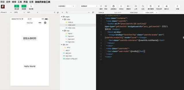 这个教程的前两篇文章,介绍了如何用下图所示的微信开发者工具自动生成一个Hello World的微信小程序,并讲解了这个自动生成的微信小程序的视图开发原理。