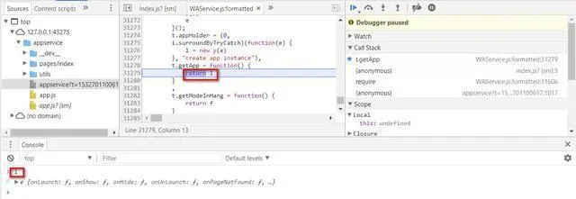为什么这个app实例如此重要,以至于放到控制器的第一行代码来创建呢?我们直接在调试器里输入app然后回车,能看到这个app对象里包含了globalData这个属性和很多有用的方法。