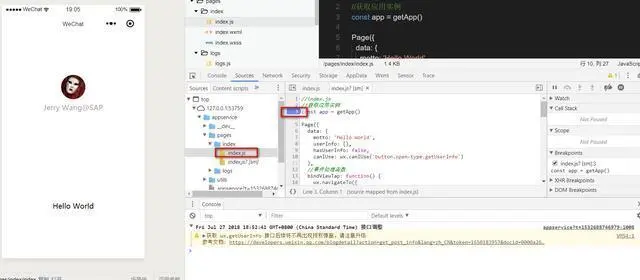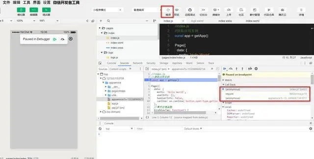点击“编译”按钮,我们的小程序自动启动,设置在控制器里的断点就自动触发了。这样我们就可以通过单步调试的方式来学习微信小程序控制器的调用上下文了。