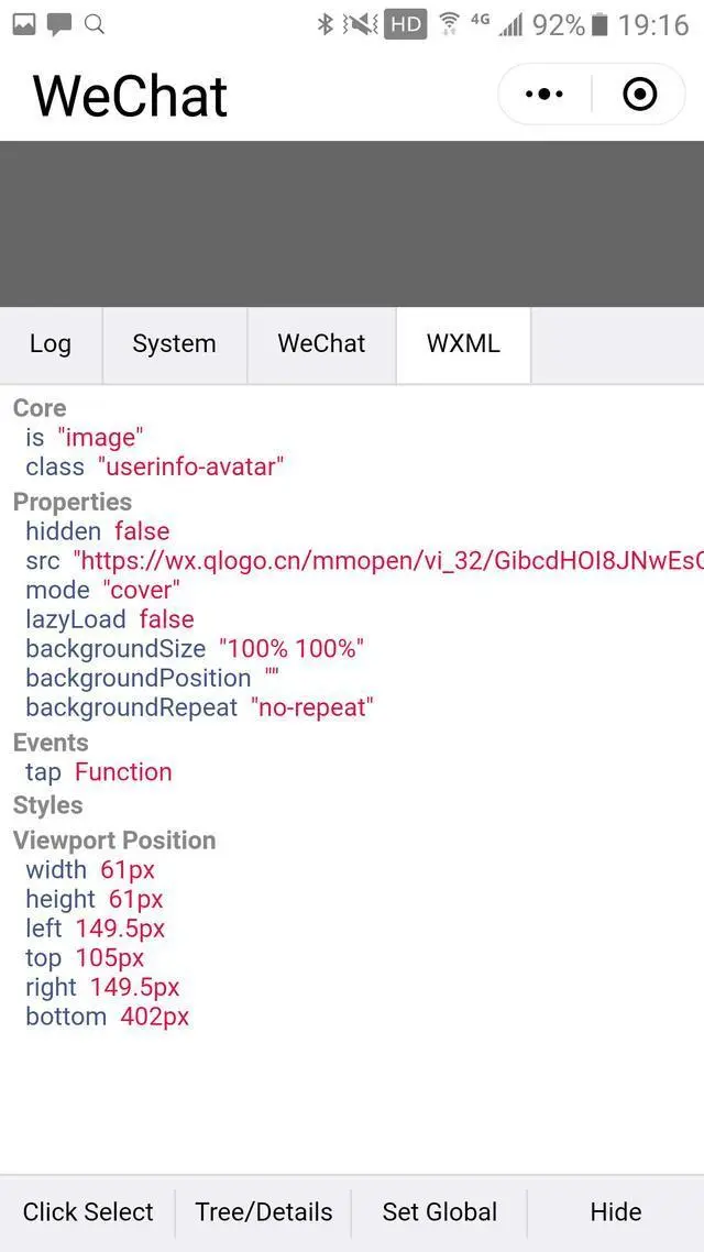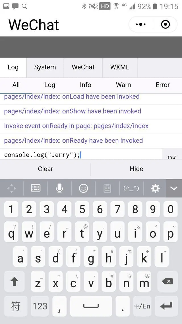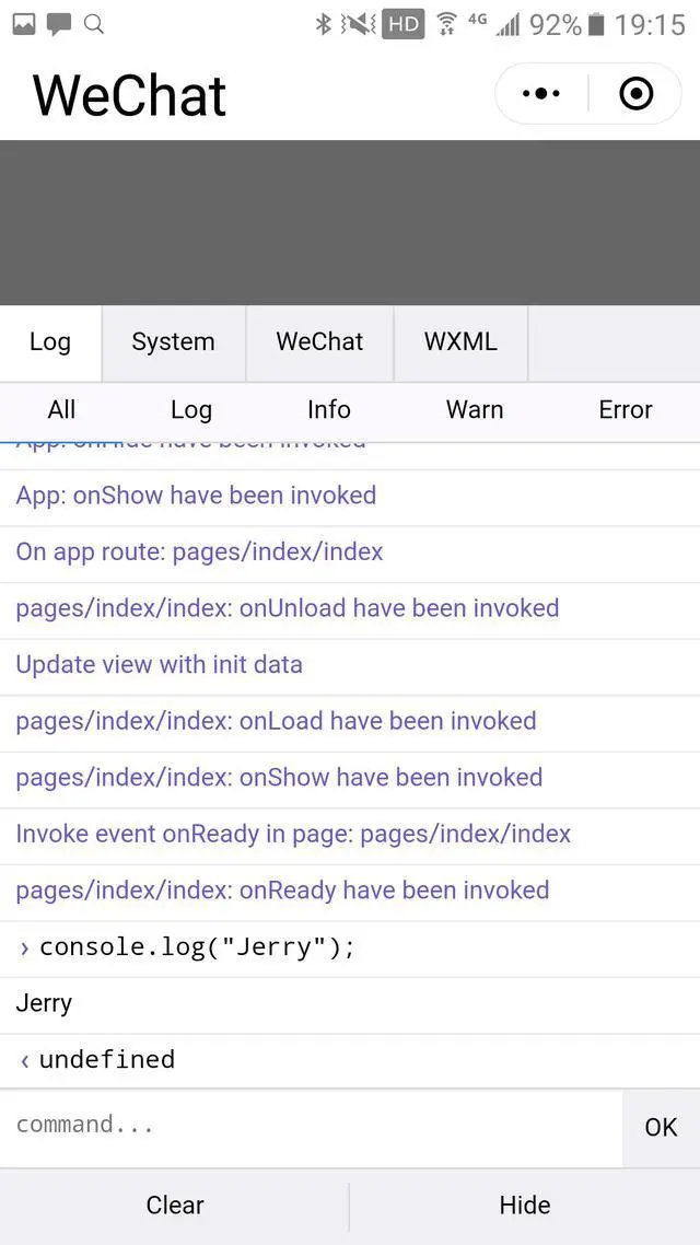 接着整个手机屏幕就被微信小程序的调试器充满了。这个调试器和电脑上安装的微信开发者工具相比,仅仅能显示日志和执行一些简单的JavaScript操作,但是不能像电脑上那样,进行JavaScript代码的调试。