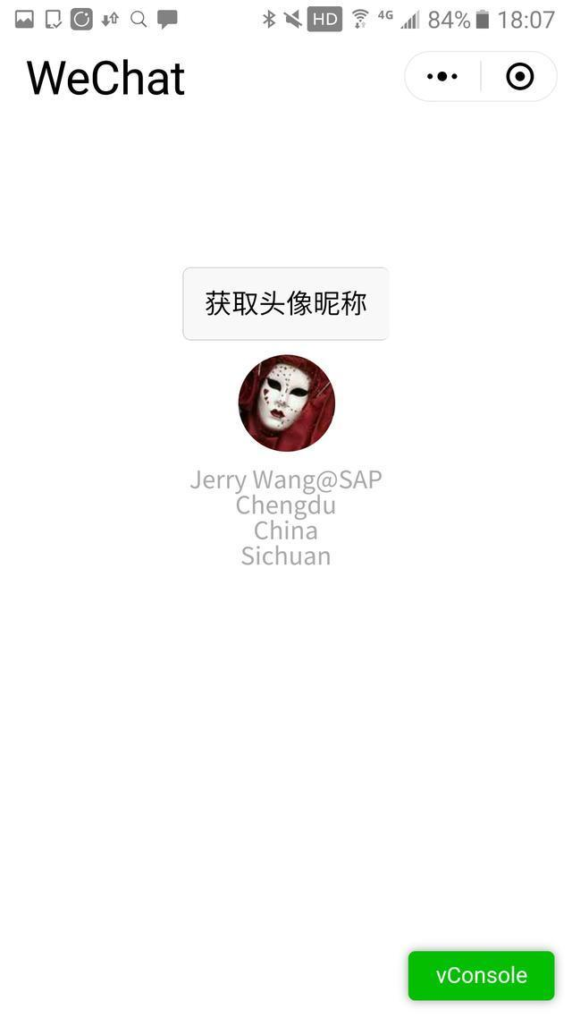 点击之后,微信小程序会自动通过微信框架提供的API把当前点击这个按钮的微信用户的明细,比如昵称,头像,所在省份,城市等信息取回来,并且显示在小程序页面上, 如下图所示。