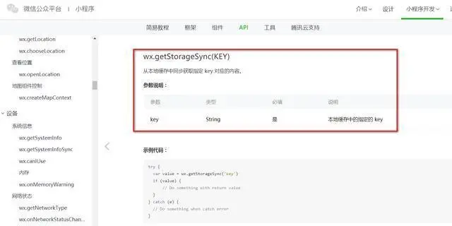 wx.getStorageSync的含义在微信小程序官网上有定义:从本地缓存中同步获取指定 key 对应的内容。