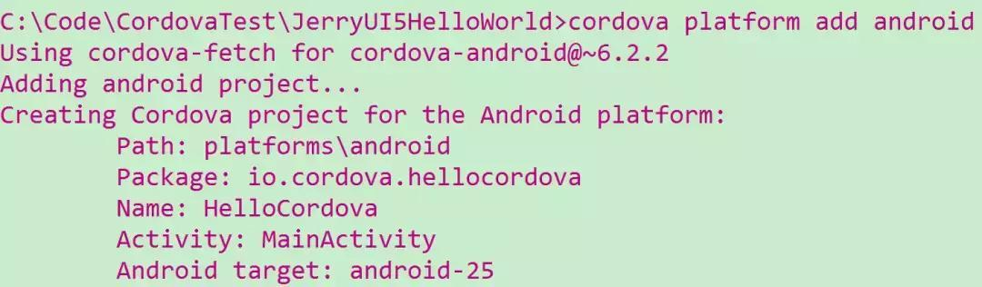 假设我想生成基于Android平台的混合应用,那么用命令行添加对Android平台的支持: