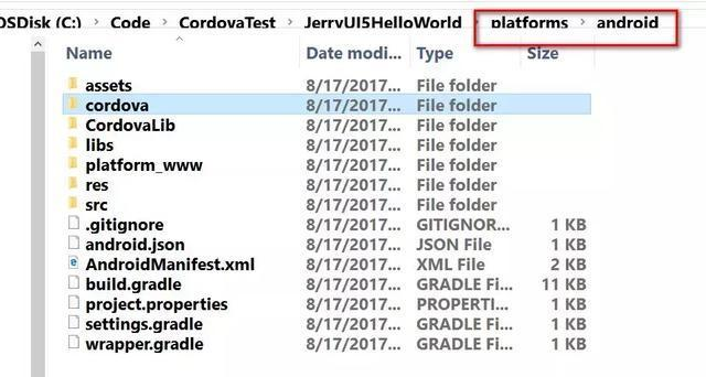 现在在Cordova项目下platforms文件夹里,会多出一个android文件夹,里面包含的是运行于Android平台的混合应用所必需的资源。