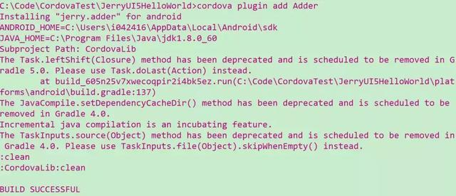 Java开发结束后,通过下面的命令行将插件添加到混合应用中,再使用cordova compile就能得到最新的包含了这个自定义插件的apk。