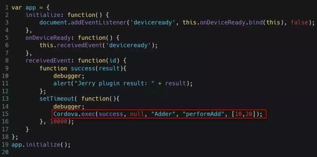 在前端JavaScript代码里,使用Cordova提供的接口,Cordova.exec来消费插件,见下图第15行,执行加法的两个操作数10和20通过数组传入。