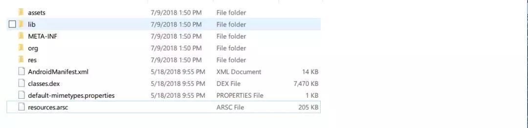 我将从Android应用市场下载下来的apk文件后缀名改成zip,然后解压缩。得到如下的文件夹,这是一个经典的Android应用apk包的结构: