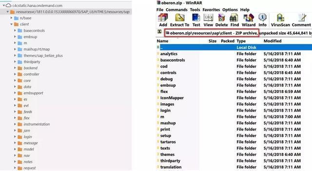 下图左边是登录某个C4C系统后在Chrome开发者工具的Sources标签页里观察到的加载的JavaScript文件,右边是混合应用的apk文件里包含的oberon.zip里的内容。