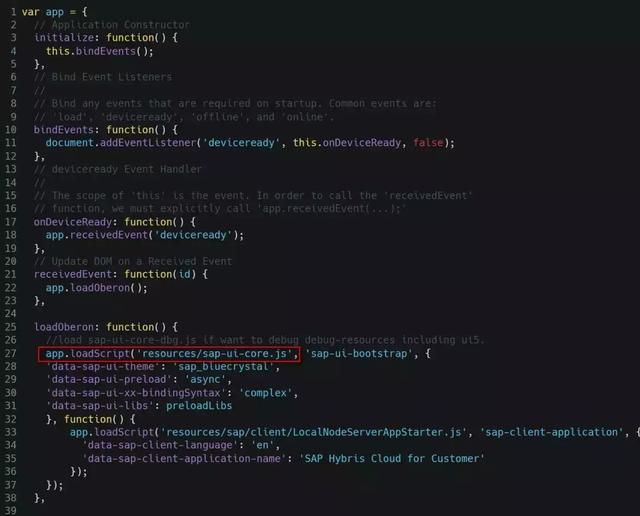 可以看到index.html加载了两个js文件,运行了app.initialize()方法,该方法被定义在加载的第二个js文件js/index.js里面,打开这个index.js文件之后发现的确是该initialize 方法加载了SAP的UI标准库,主题库,语言等:第27行的sap-ui-core.js就是我们的老朋友了。
