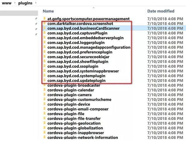 Jerry之前以Java端的加法器为例,介绍了如何开发一个新的Cordova插件。Jerry也提到了SAP Mobile Platform里开发的Cordova插件的集合称为Kapsel。同样,在C4C基于Android平台的apk文件解压出来的文件夹中,我们也能发现很多SAP C4C Cordova插件:
