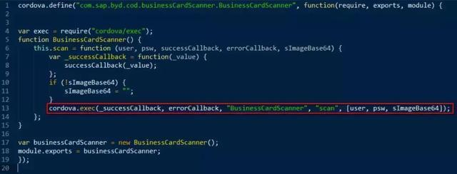 随便打开一个文件夹com.sap.byd.cod.businessCardScanner里的JavaScript文件,从下图第13行能看出,同之前Jerry在他的测试前端应用里消费自开发的Java加法器插件一样,用JavaScript消费Java插件的方法仍然是调用Cordova框架提供的方法cordova.exec,第三个参数BusinessCardScanner即对应插件实现的Java类名称,scan即这个Java类的一个public方法名称,用于实现插件的业务逻辑。