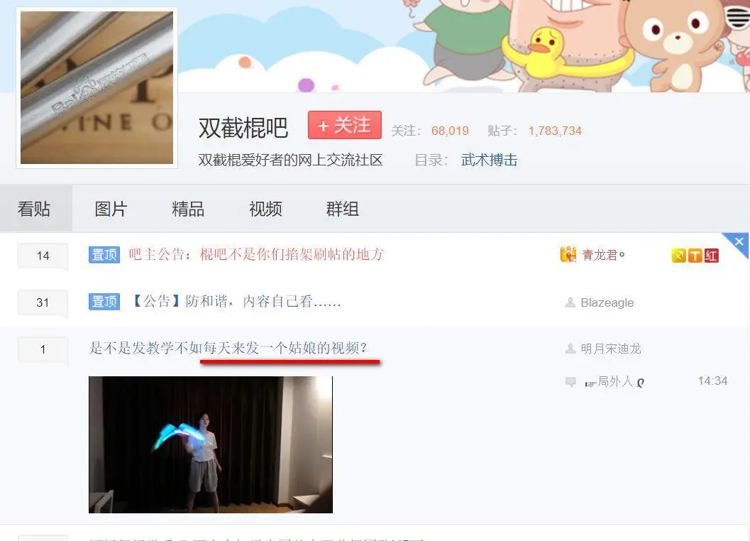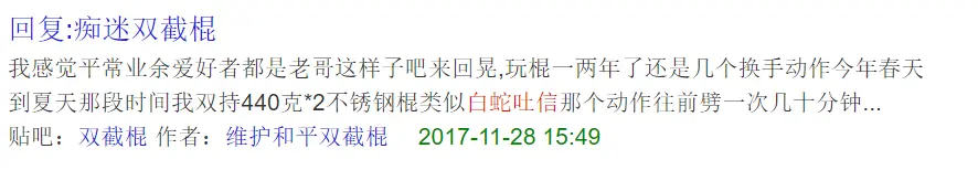 环境搭好后,然后是网上找教程。我当时到百度贴吧的双截棍贴吧里一看,发现里面很热闹,从业余界的顶尖高手到菜鸟都有。很多朋友都上传了自己的练习视频到贴吧里,其中不乏一些女性爱好者。我想:既然他们能学会,我为什么不能?于是,我兴致勃勃地投入了自学中。