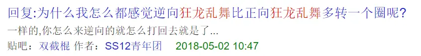 Jerry后来螺旋花转棍练熟以后,也想模仿剑舞狂沙这种转棍->劈棍的转换,但马上就发现完全控制不住棍的运行轨迹——从初始状态开始劈棍和从转棍状态开始劈棍发力的方式完全不同。