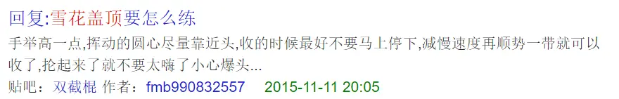 同样,双截棍贴吧里有新人发了一些请教贴 : "如何快速学会双截棍”?一些老司机的回答:多练,多挨打。Jerry的学习经验就是,正如希望不呛水就能学会游泳是一件不现实的事情一样,双截棍的初学者也免不了被舞花或转棍时不听指挥的双截棍所误伤。我的一个窍门是,在练习一些很危险的动作,比如双截棍距离头部很近的转棍动作时,我会拿毛巾提前把头部包起来,带上口罩以免把门牙打落,最后再戴上帽子。
