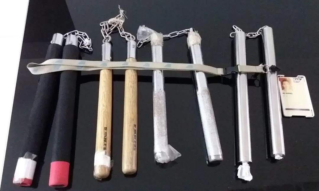 淘宝上除了不锈钢制成的双截棍之外,还有海绵棍和木棍。有的店家打的广告是这些海绵棍(就是上图最左边那根)专门用于双截棍初学者的练习。Jerry也买过一根,然而很快发现对我这个初学者没什么用,因为海绵棍几乎没有重量,初学者用它来做舞花和转棍练习根本无法控制棍的运行轨迹。
