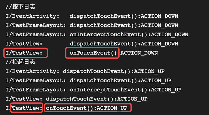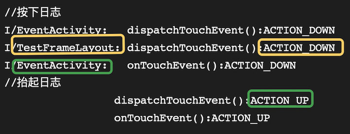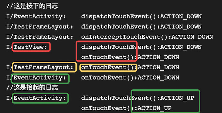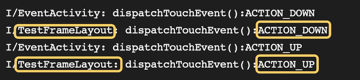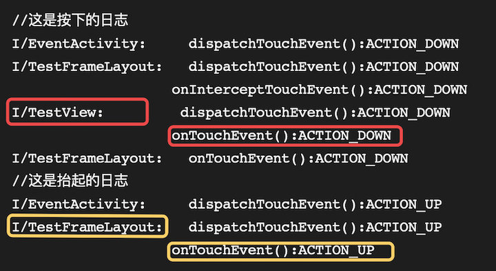 下面红色框为子控件日志信息,事件分发给ViewGroup的子组件TestView,但是它没有处理,事件回传给ViewGroup(黄色框中的日志),它的onTouchEvent返回true,代表事件被他消耗了,后续的事件也将分发给他处理。