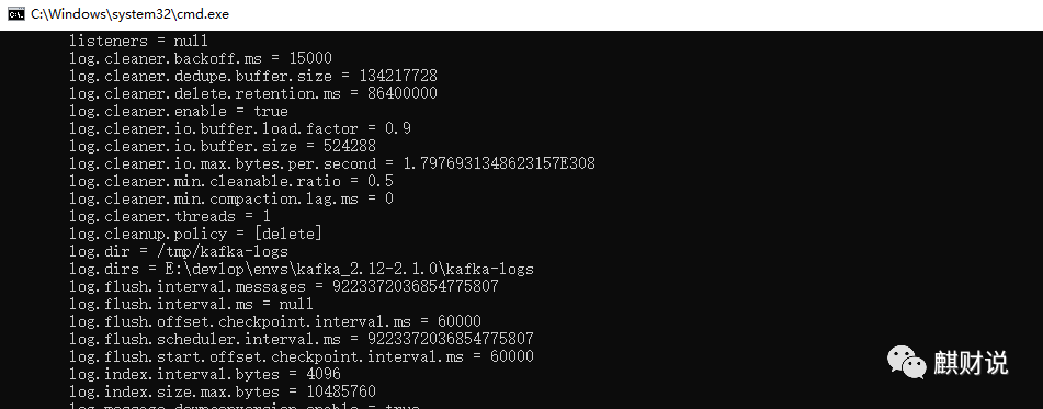 server.properties文件,修改log.dirs=$kafka解压路径\kafka-logs,这个路径可自行配置,只要有权限写入即可 -