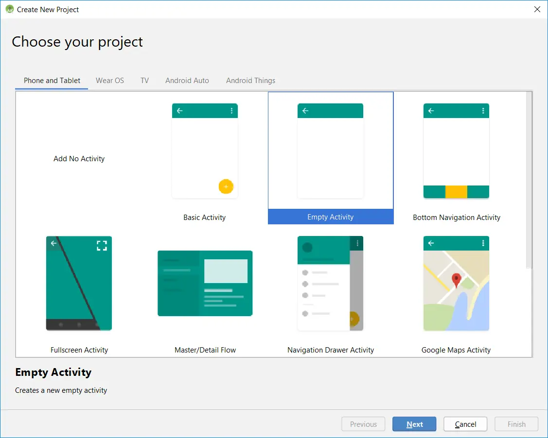 Create a new project in android studio. Go to File -> New Project and select “Empty Activity”. Then click Finish.